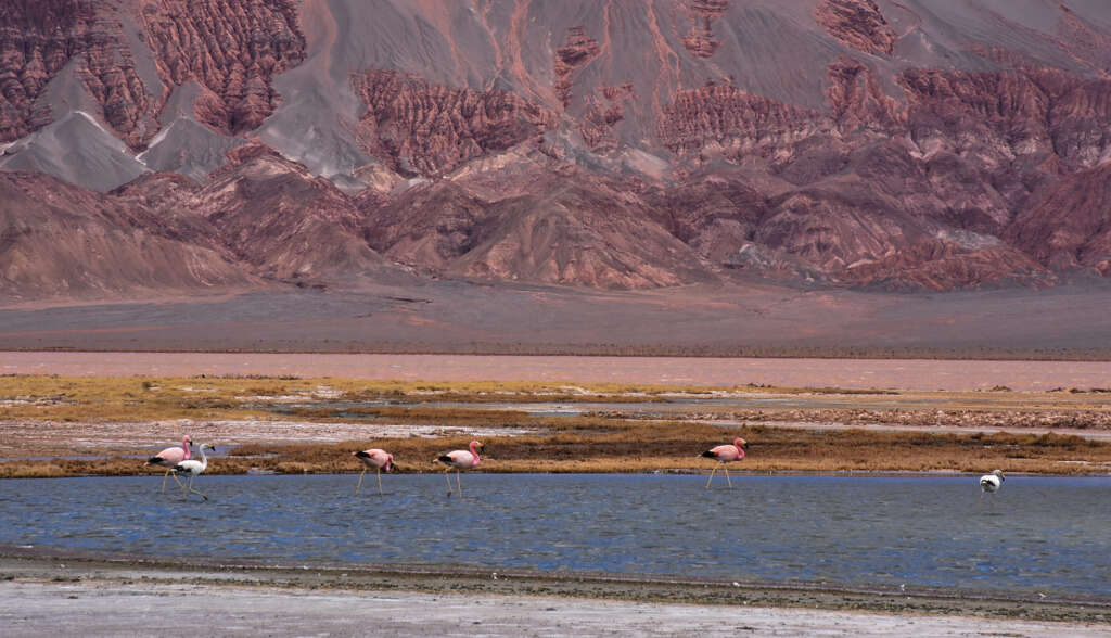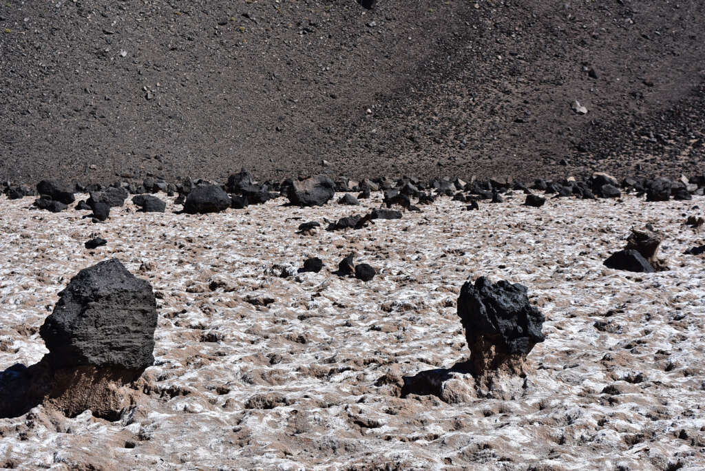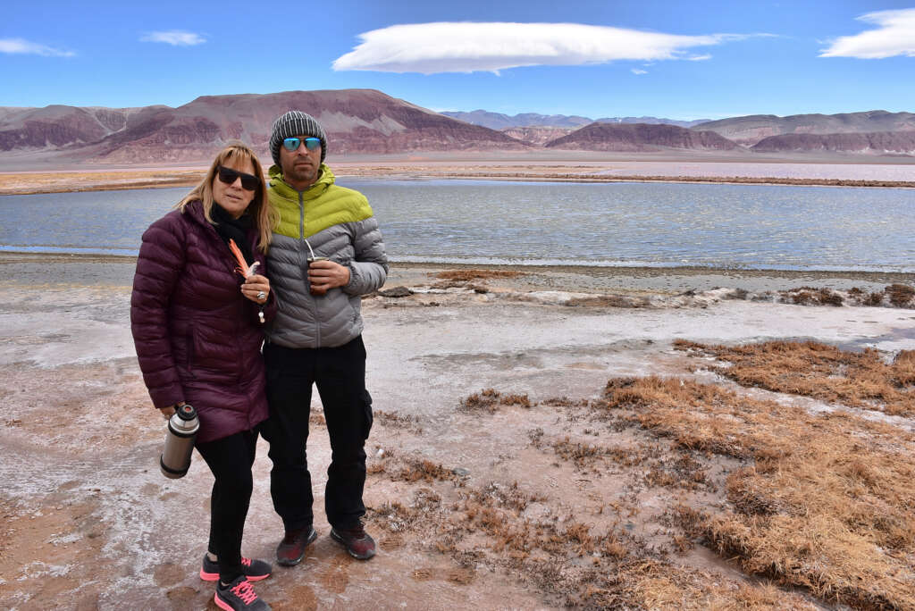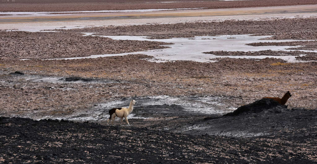 Con las sensaciones a flor de piel, emprendimos el regreso hacia Antofagasta de la Sierra por el mar de arena, Lucas sigue conduciendo la camioneta sorteando verdaderas olas de arena oscura, comenzamos a rodear el Volcán Carachi Pampa, el suelo lleno de piedra de lava y basáltica hace lento el avance, rodeados de llamas y algunas vicuñas, nos detuvimos en la laguna Carachi, y ahí pudimos ver algunos de los flamencos rosados que ya habían comenzado a llegar…