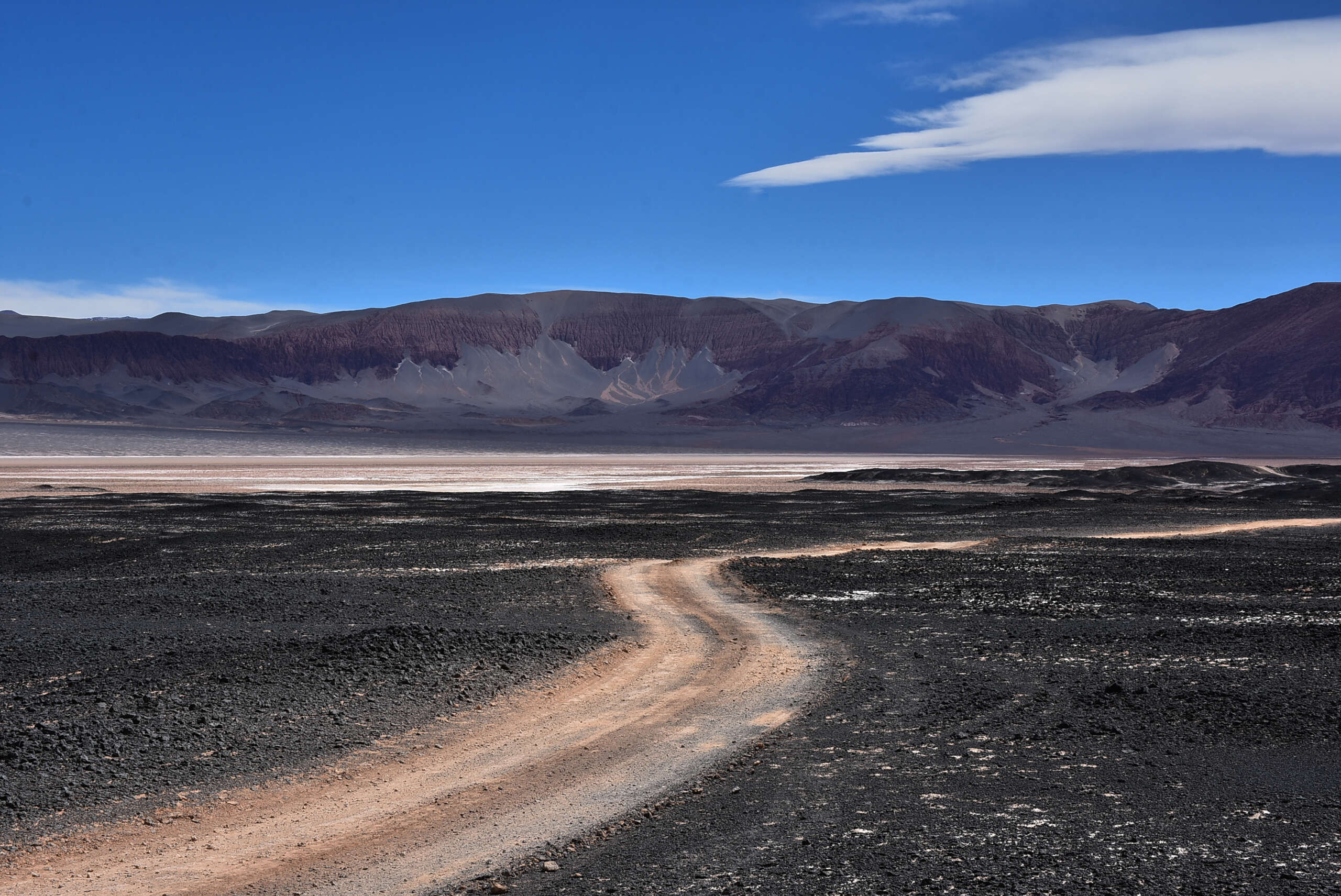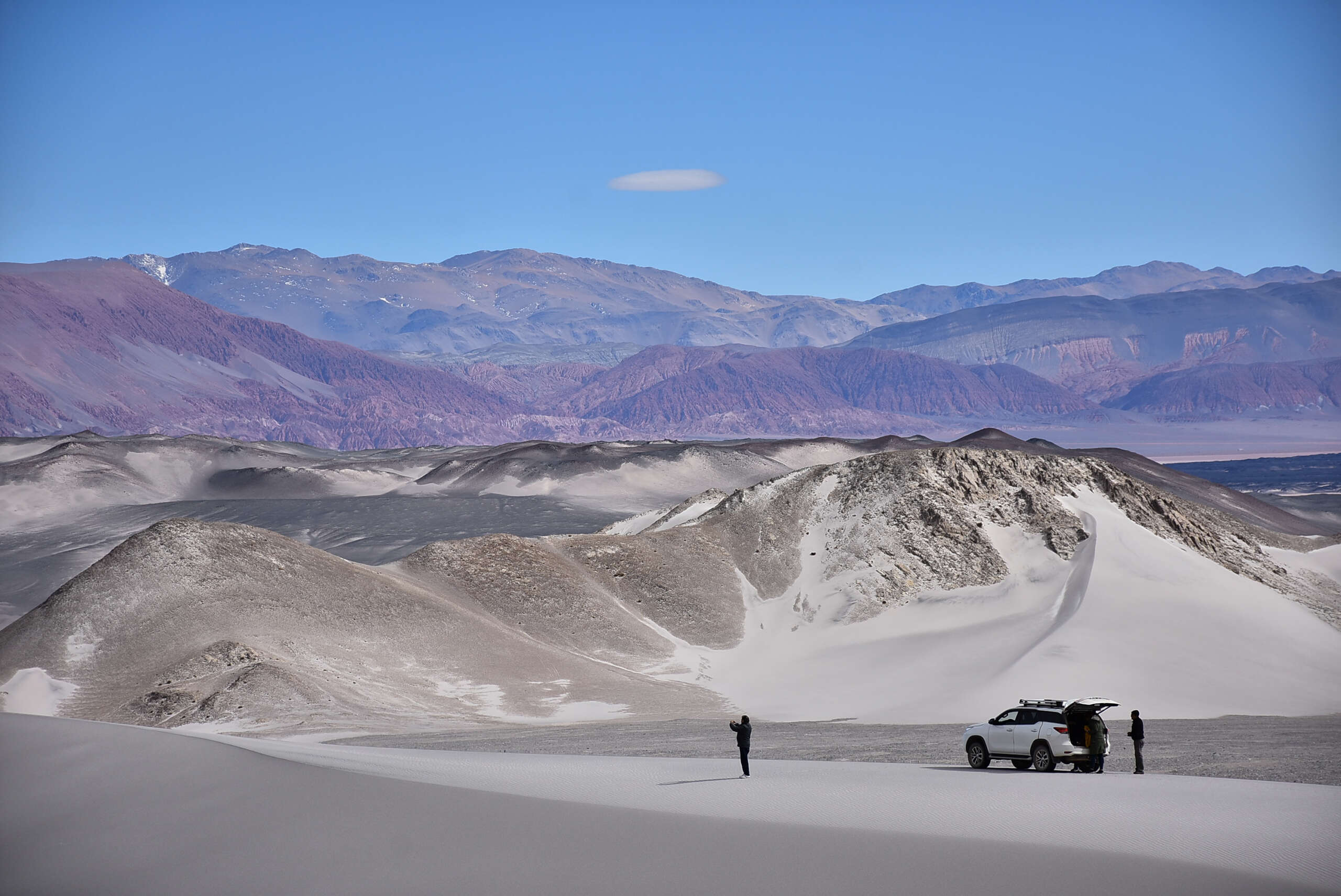 Con las sensaciones a flor de piel, emprendimos el regreso hacia Antofagasta de la Sierra por el mar de arena, Lucas sigue conduciendo la camioneta sorteando verdaderas olas de arena oscura, comenzamos a rodear el Volcán Carachi Pampa, el suelo lleno de piedra de lava y basáltica hace lento el avance, rodeados de llamas y algunas vicuñas, nos detuvimos en la laguna Carachi, y ahí pudimos ver algunos de los flamencos rosados que ya habían comenzado a llegar…
