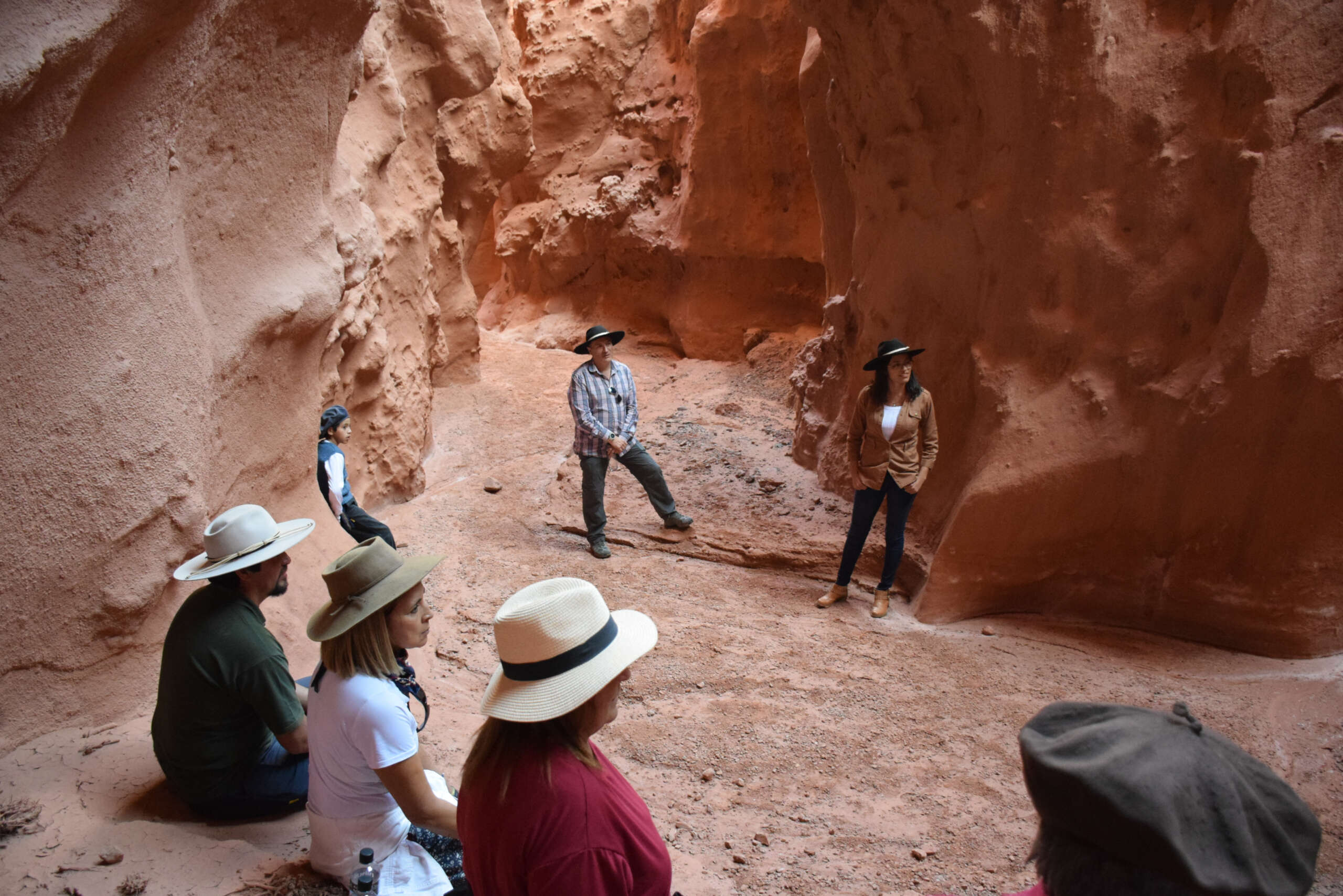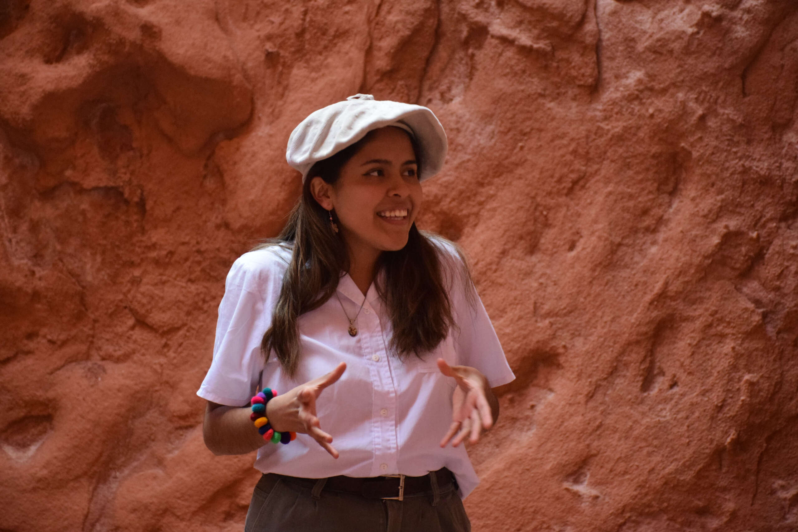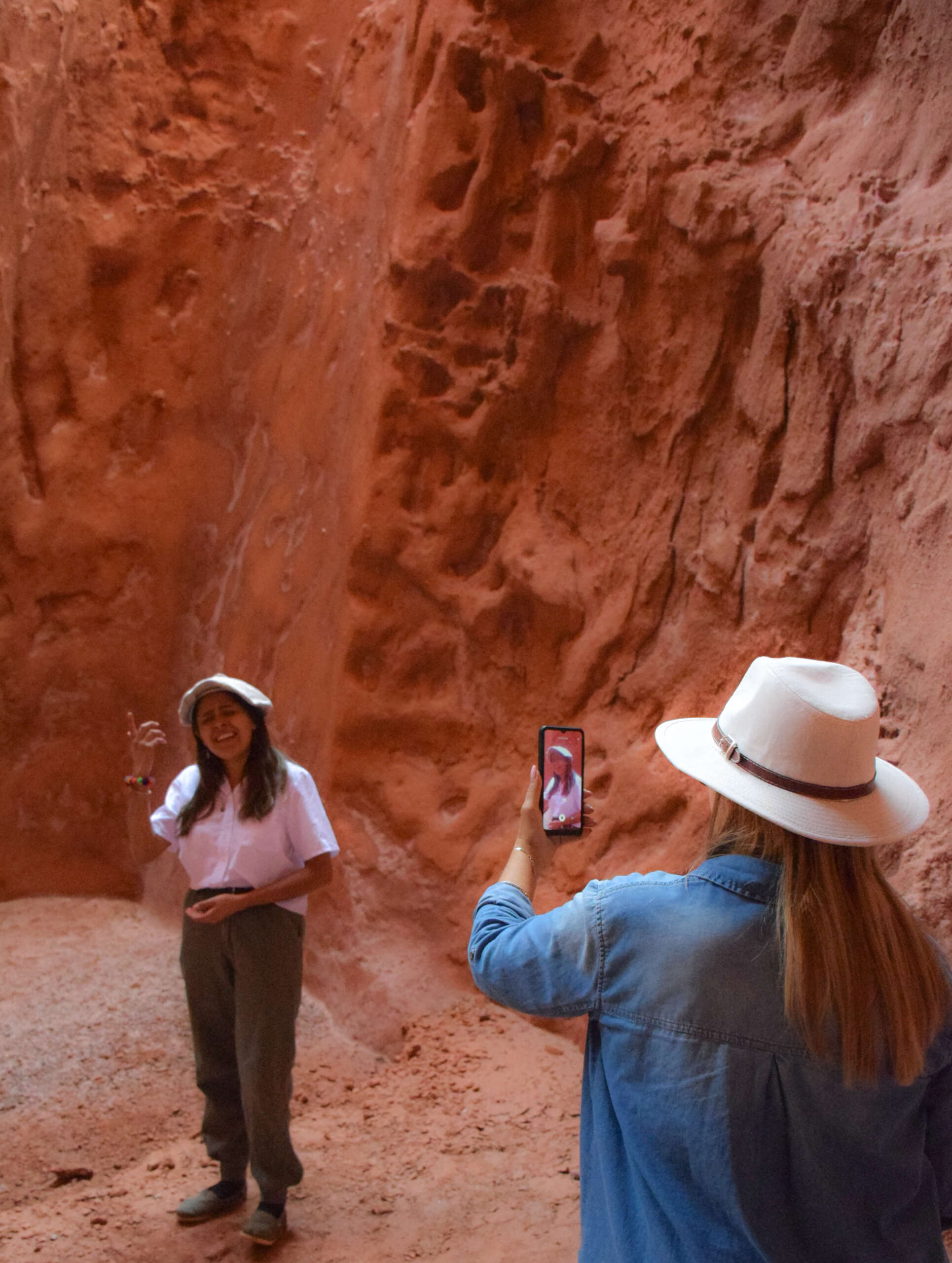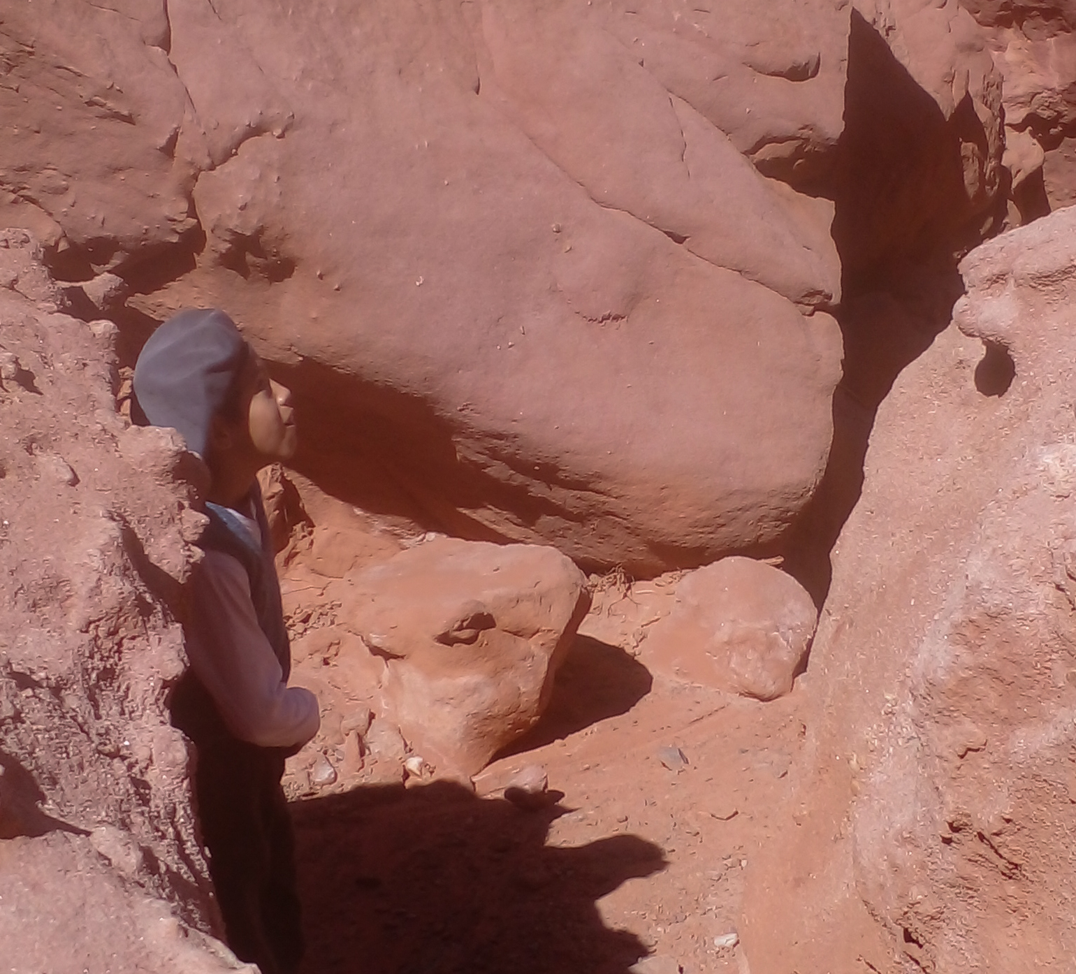 En un momento no pudimos avanzar más, bajamos de los caballos que quedaron a cargo de Fidel y comenzamos a caminar por pasadizos angostos entre los cerros hasta llegar a una cueva. De pronto, Agustina, una niña hermosa, reina de la Vendimia de Animaná que era parte del grupo, comenzó a cantar «Fuego en Animaná» su voz en esa acústica natural hizo de ese momento algo sublime, que creo que quedará para siempre en el corazón de cada uno de los que estábamos ahí.