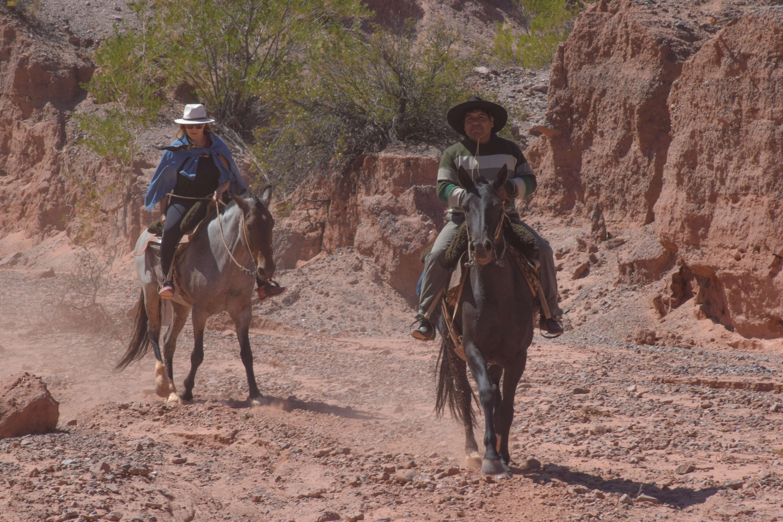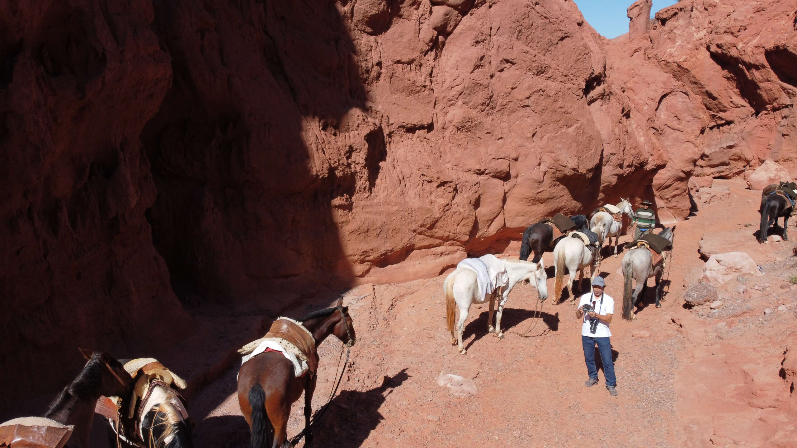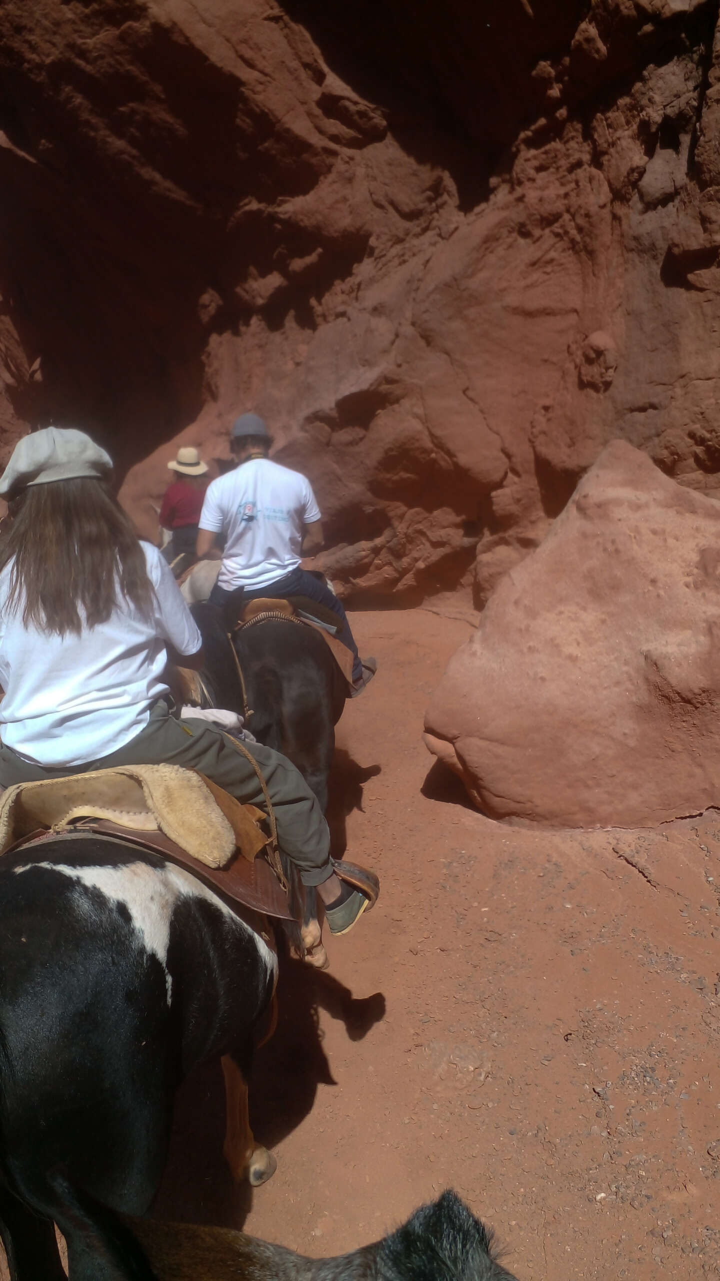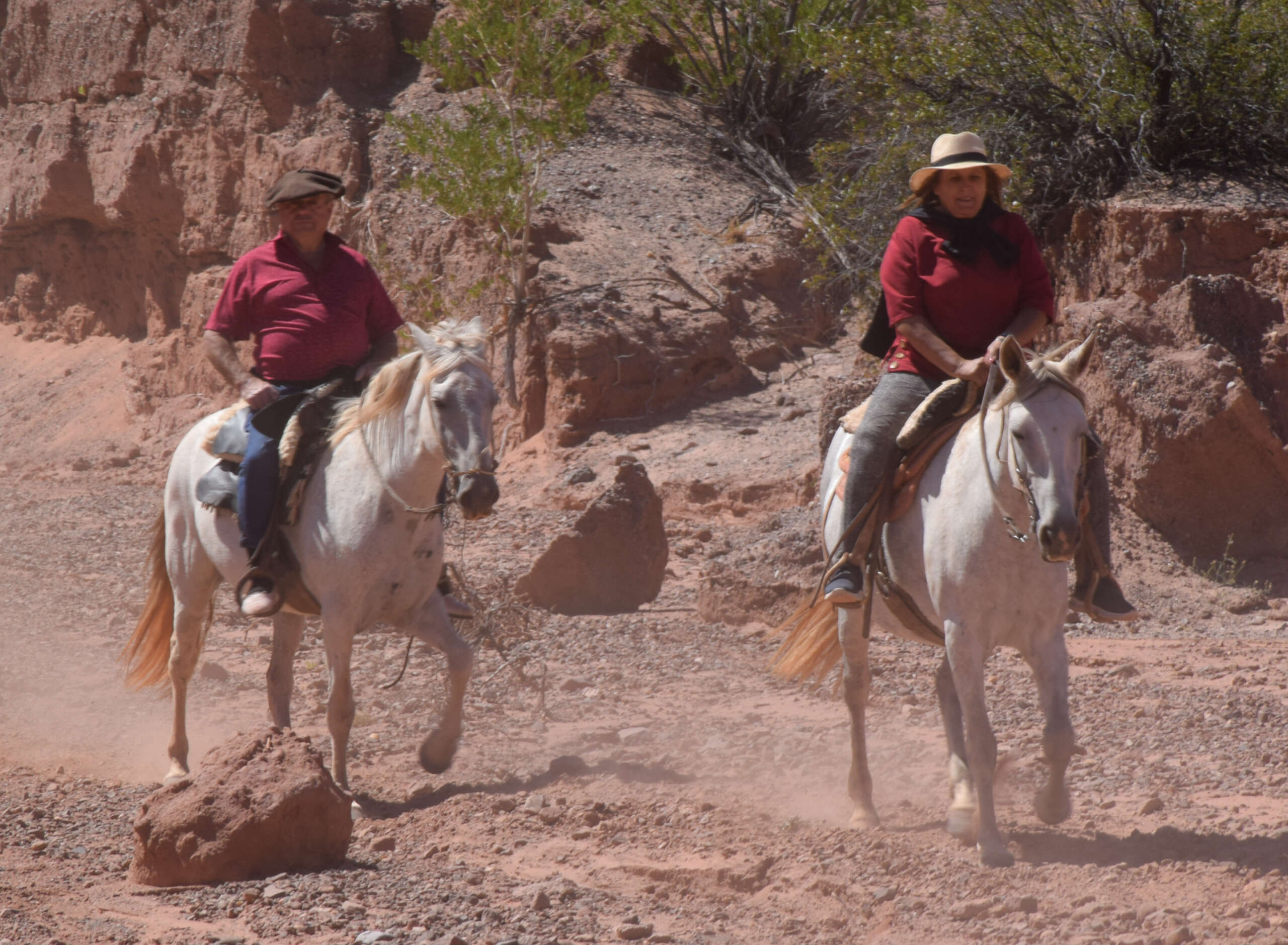 Fidel, León y Walter ensillaban los caballos y allí partimos. Once personas hicimos la cabalgata, primero por una llanura rodeada de cerros hasta que comenzamos a internarnos por el Cañón del Colorado del Cerro «El Zorrito».