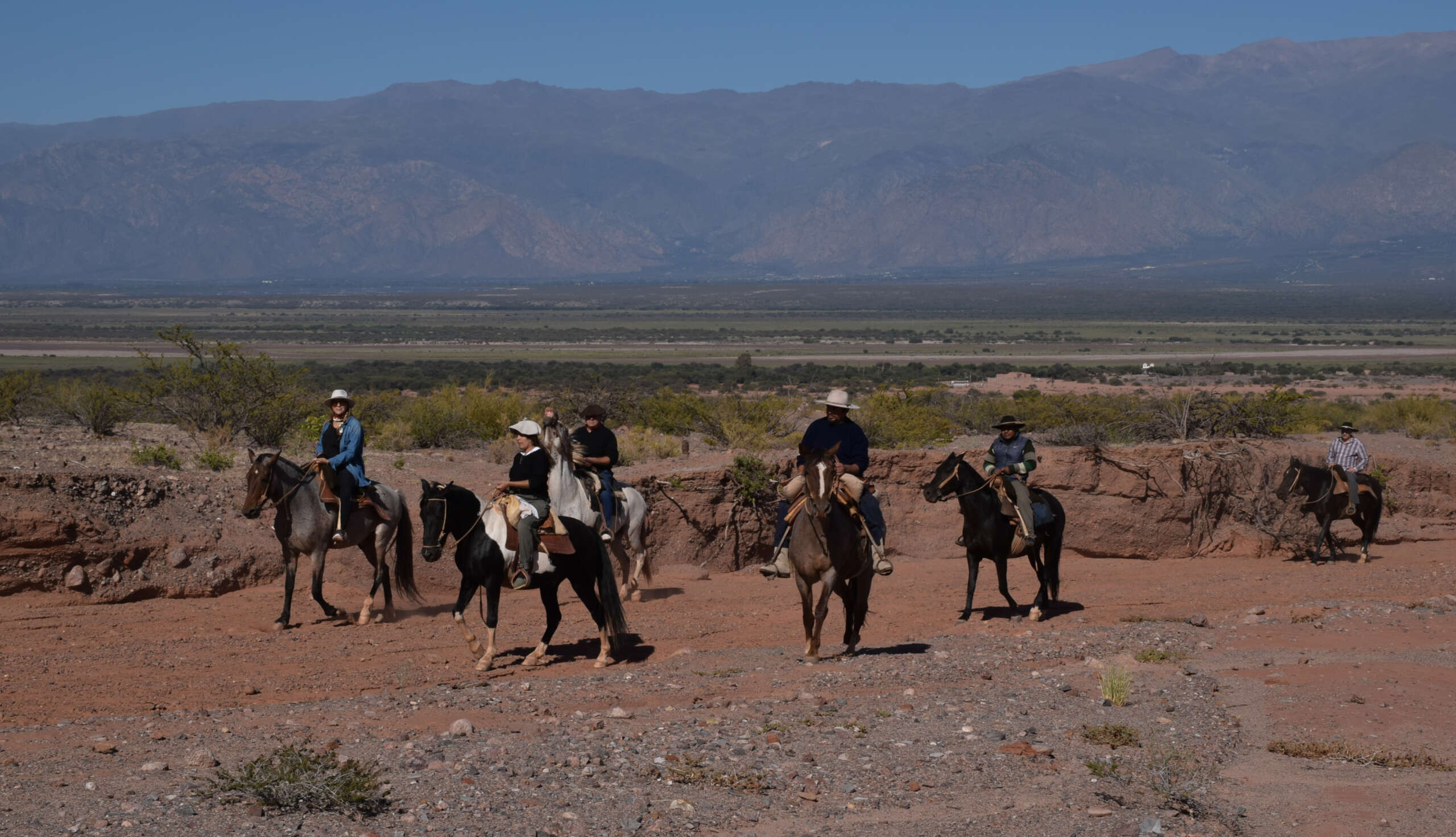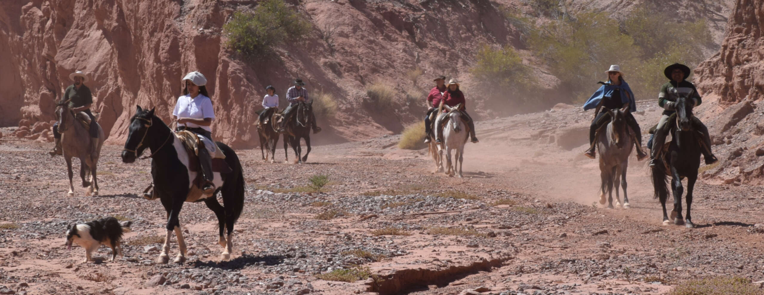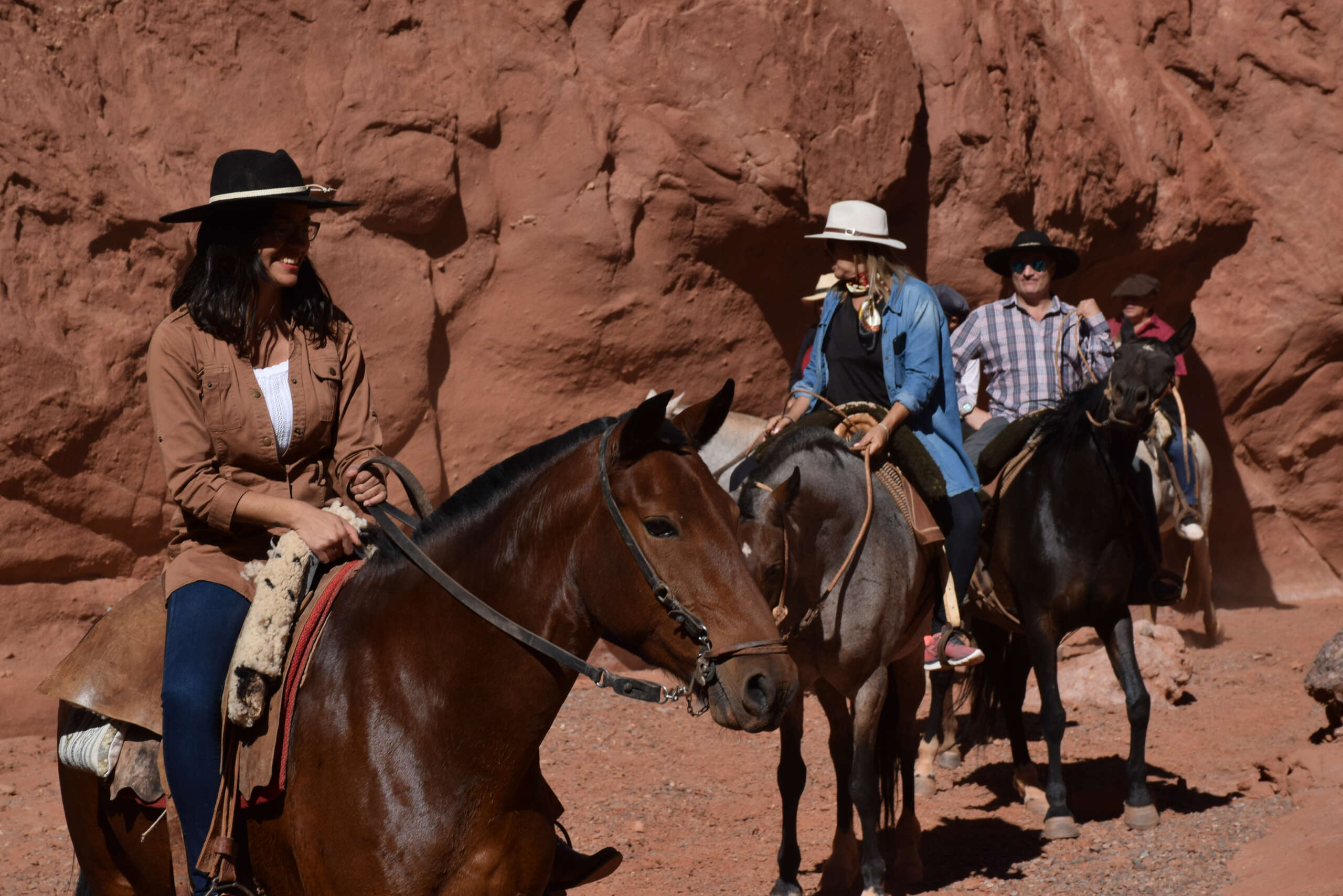 Fidel, León y Walter ensillaban los caballos y allí partimos. Once personas hicimos la cabalgata, primero por una llanura rodeada de cerros hasta que comenzamos a internarnos por el Cañón del Colorado del Cerro «El Zorrito».