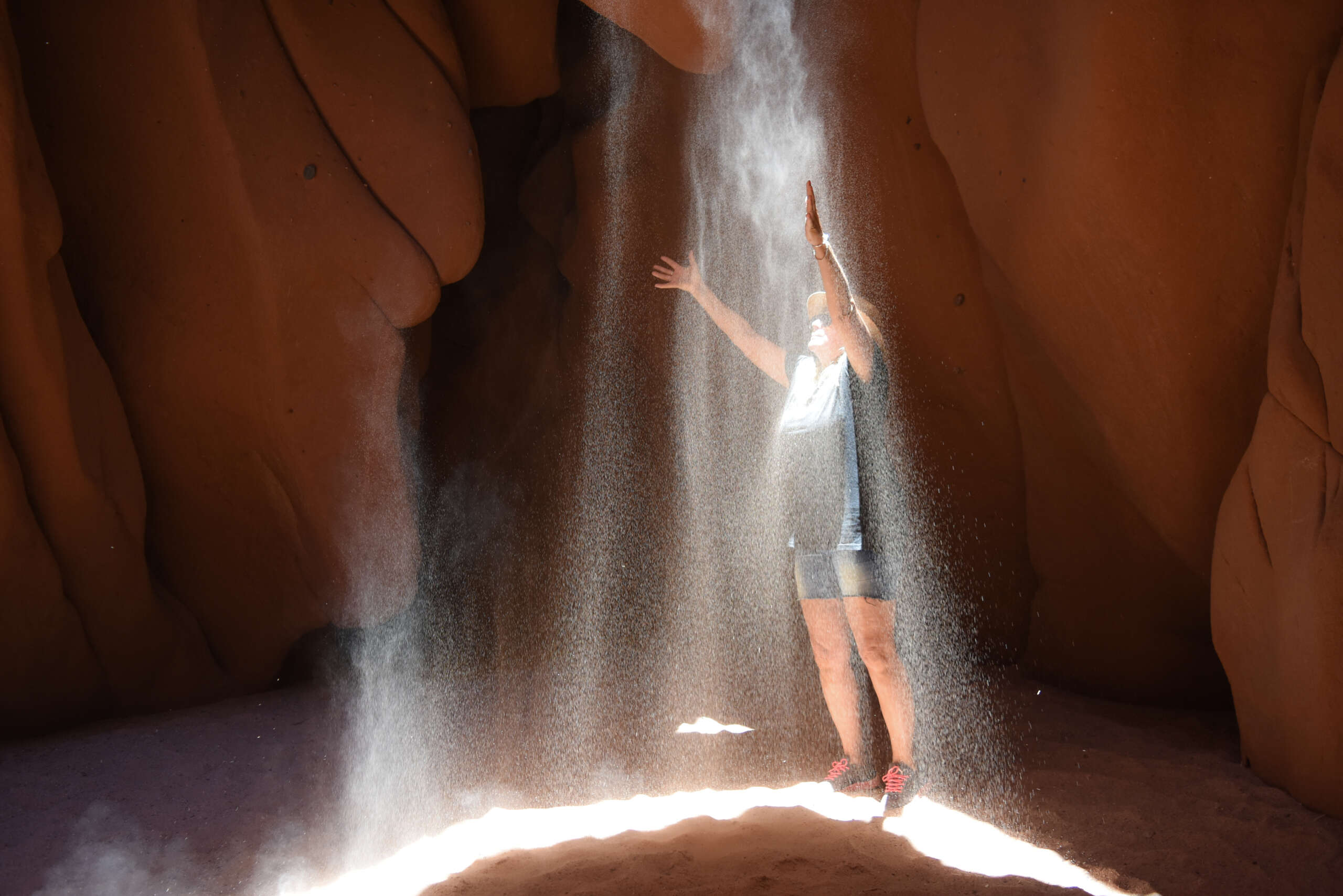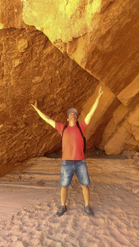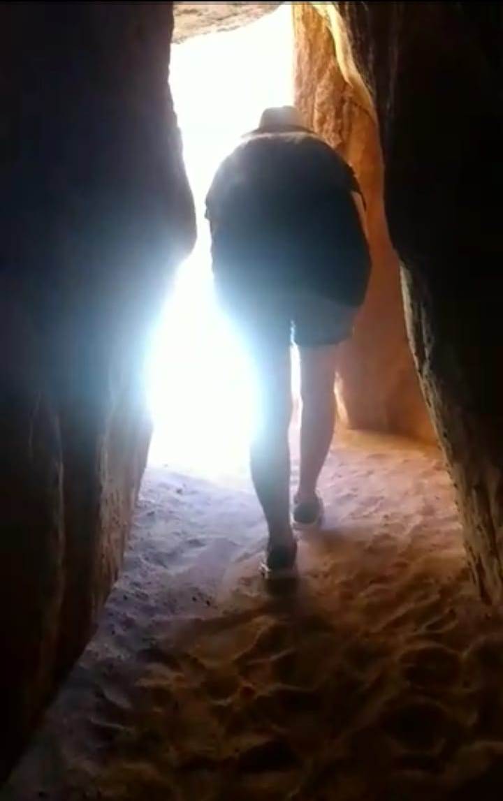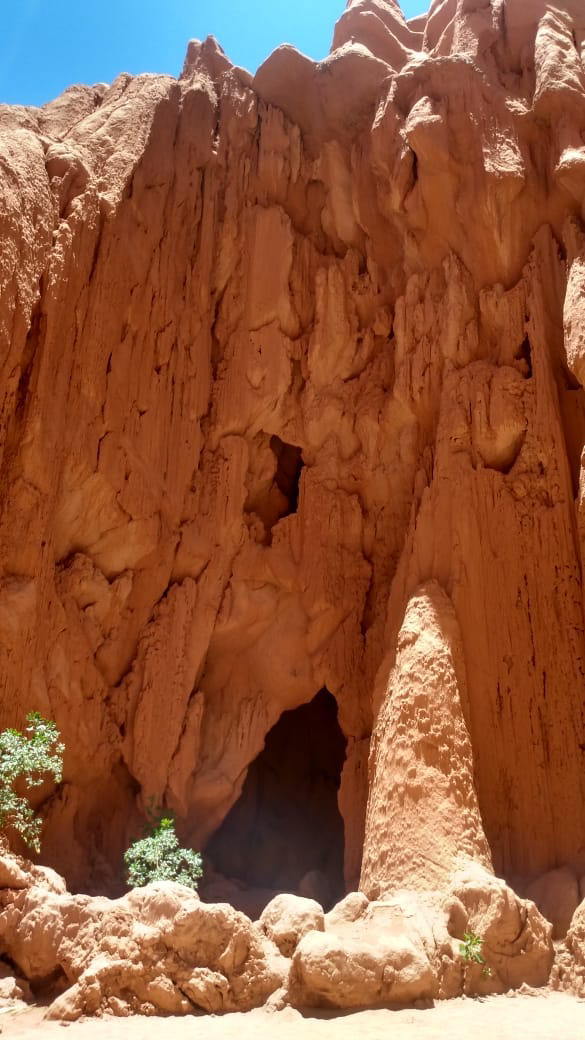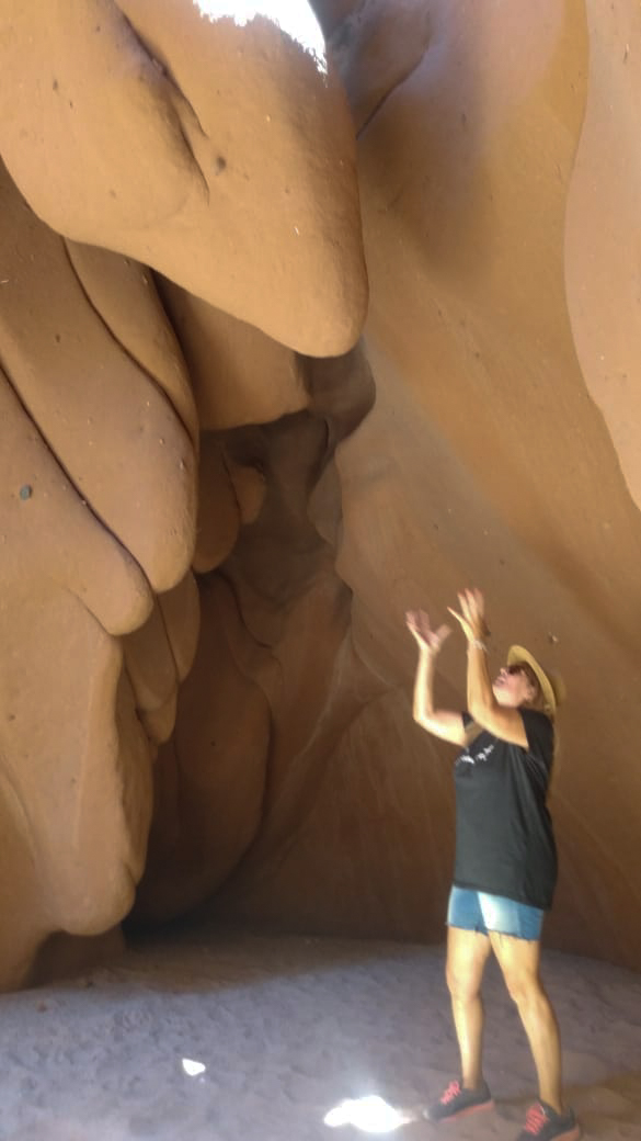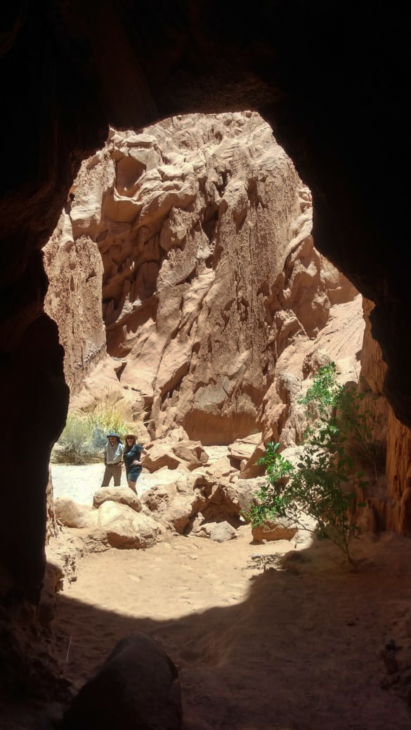 Continuamos, caminábamos sobre una arena más fina, caliente por el sol. De pronto unos pasadizos en zig-zag, los cruzamos en fila, agachados…y ahí estábamos, en el corazón de las Cuevas de Acsibi, formas extrañas, que bajaban desde lo alto, de esas montañas imponentes, rayos de luz que se filtraban y producían una lluvia de arena dorada. Cuevas altísimas, uno no puede imaginar que existan sitios así, y creo que nuestra geografía, seguramente tendrá todavía lugares preservados, inhóspitos, secretos, que los humanos aún no llegaron a descubrir.