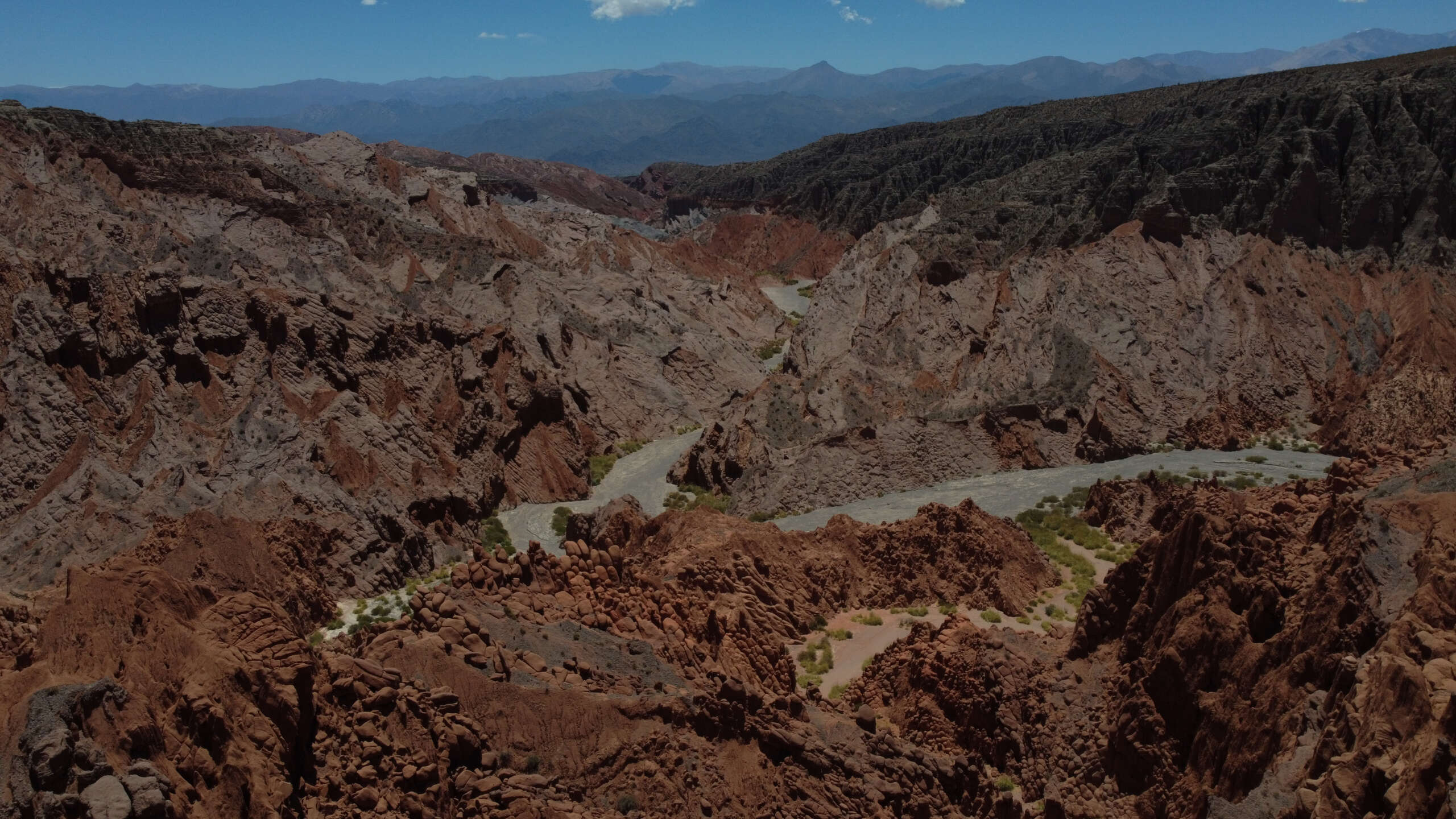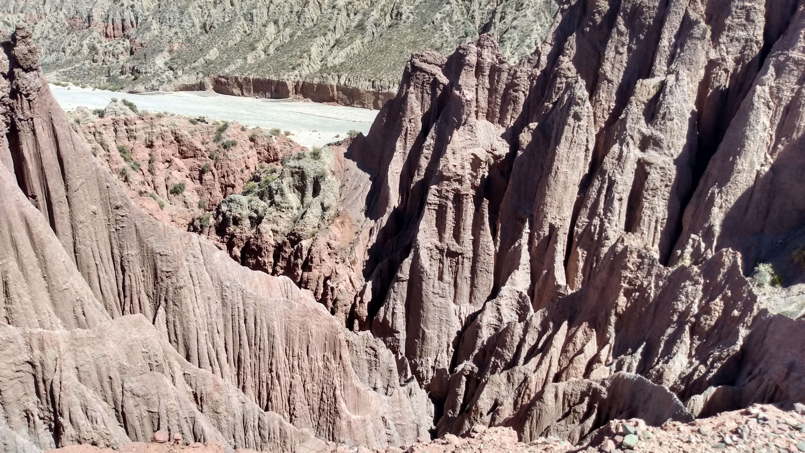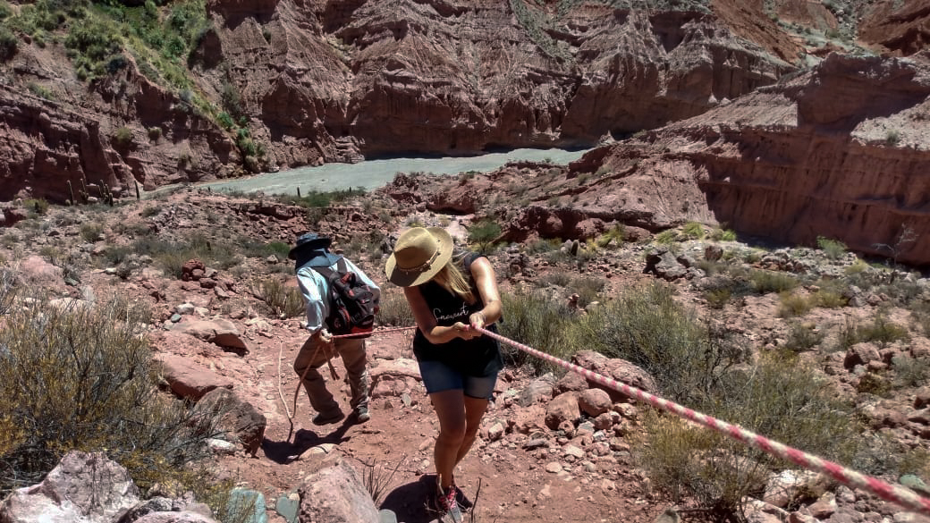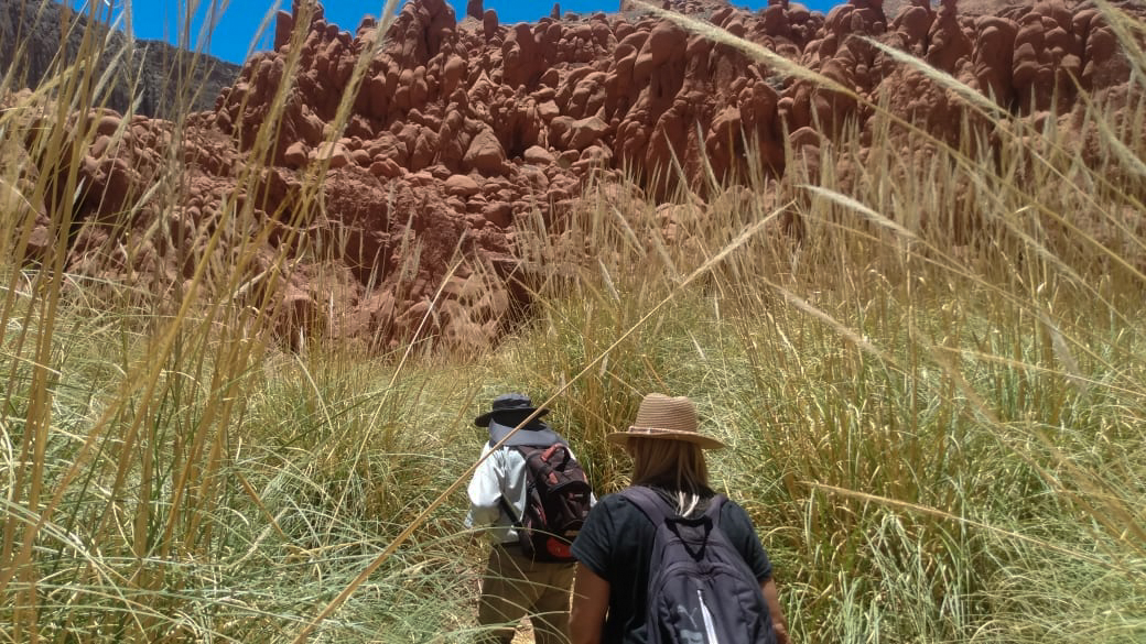 Comenzamos a descender la montaña ayudados con sogas hasta el lecho del río, el sol es abrazador en esa época del año. Caminamos por ese pedregullo, rodeados de montañas altísimas con colores y formas distintas, hasta encontrarnos en unos totorales, lo único verde que veíamos desde hacía unas horas. Tavo se detuvo, se paró frente nuestro y nos dijo; – Estamos en la puerta del Cañón a las Cuevas-.